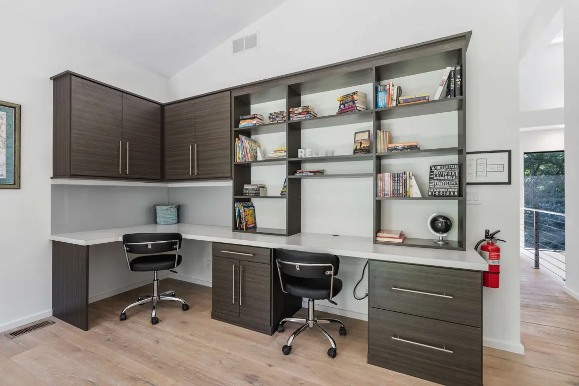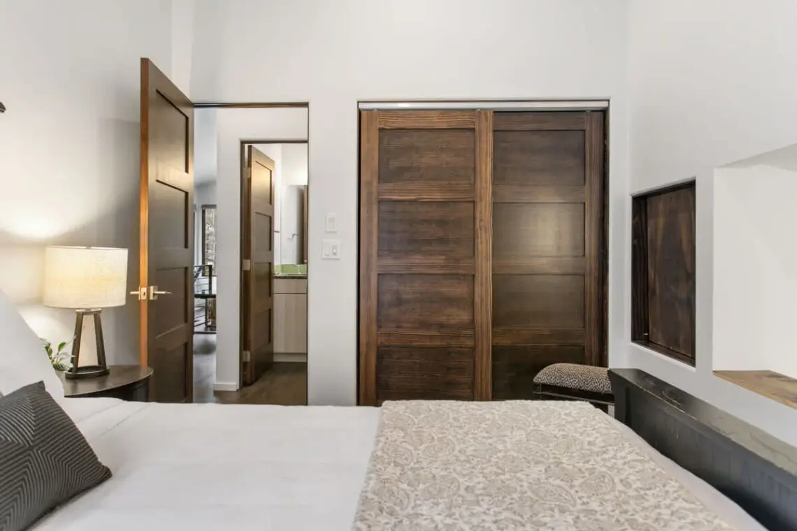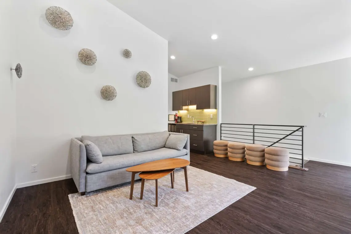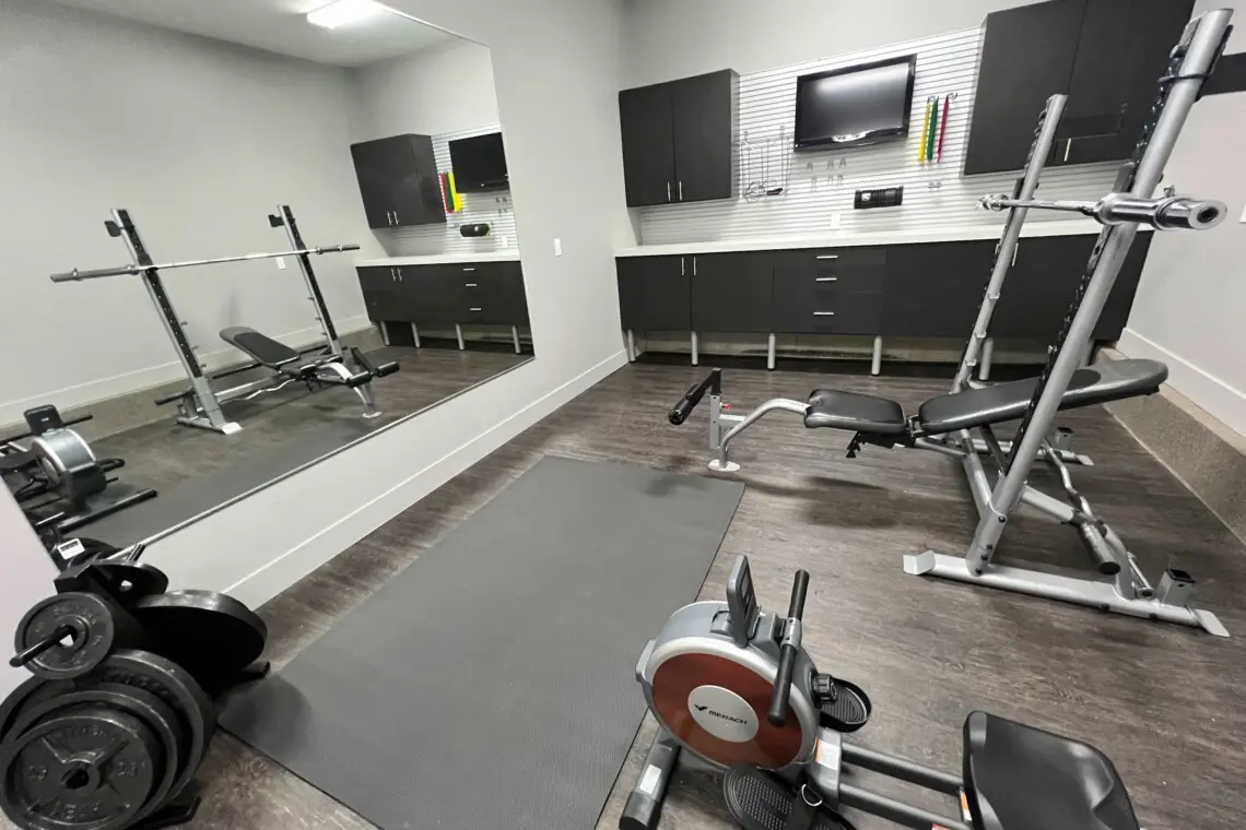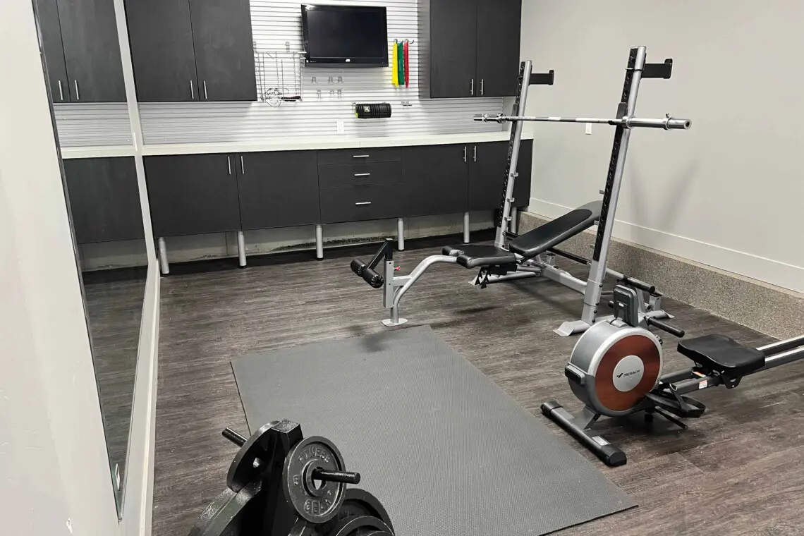 Upstairs, the king and queen bedrooms include ensuite bathrooms and televisions, with one king bedroom boasting a private balcony. The loft area and office provide additional space for working or relaxing. A separate guest suite includes two queen bedrooms, a full bathroom, kitchenette, living room with pull-out sofa, and built-in full beds — perfect for extended family or friends. One of the garage bays has been transformed into a private fitness space complete with a rowing machine, free weights, and yoga mats for keeping up your wellness routine while away.