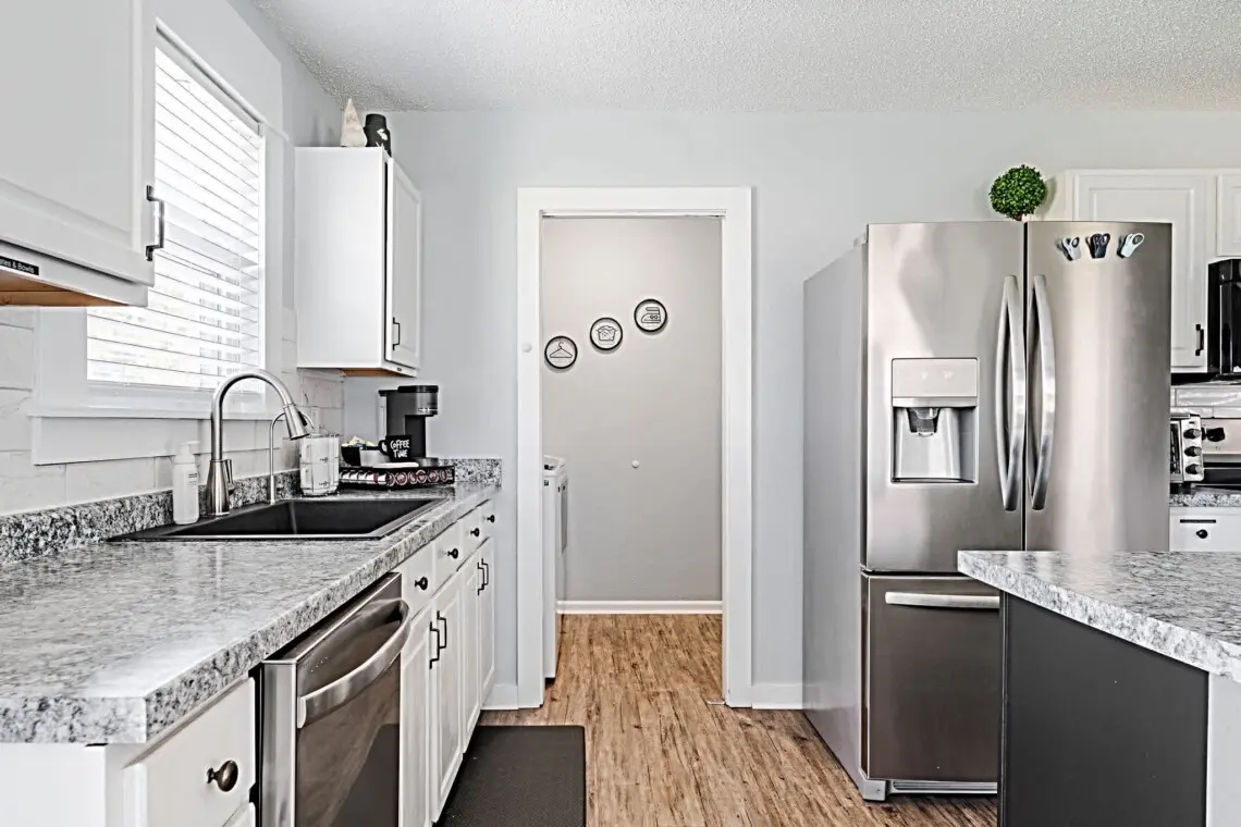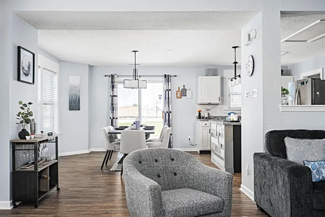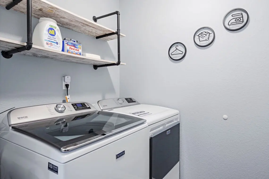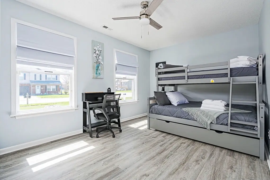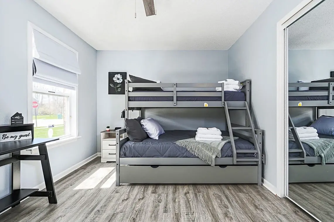 The bright and welcoming living area is perfect for relaxing after a day of exploring the Indianapolis area. Whether you’re lounging with a movie on the TV, enjoying some friendly competition with board games, or just relaxing with your favorite playlist on the stereo system, you’ll feel right at home. For your convenience, the home includes modern amenities like a washer and dryer, air conditioning, and a fully equipped kitchen with everything you need to prepare meals, including a coffee maker for your morning brew.