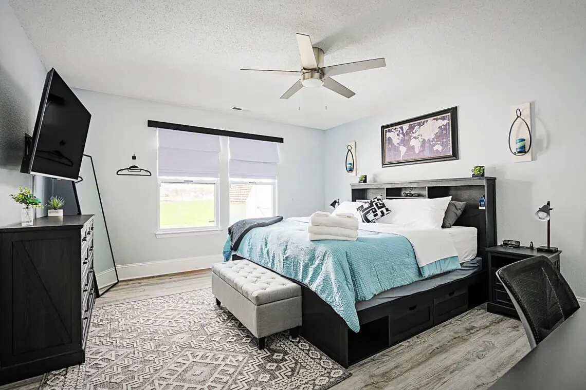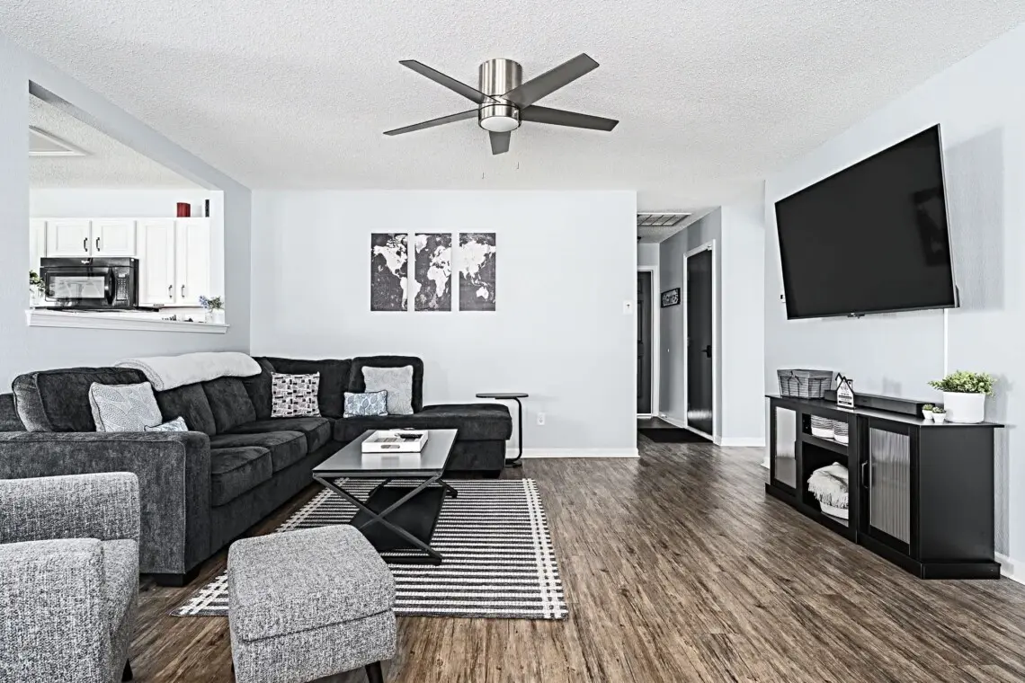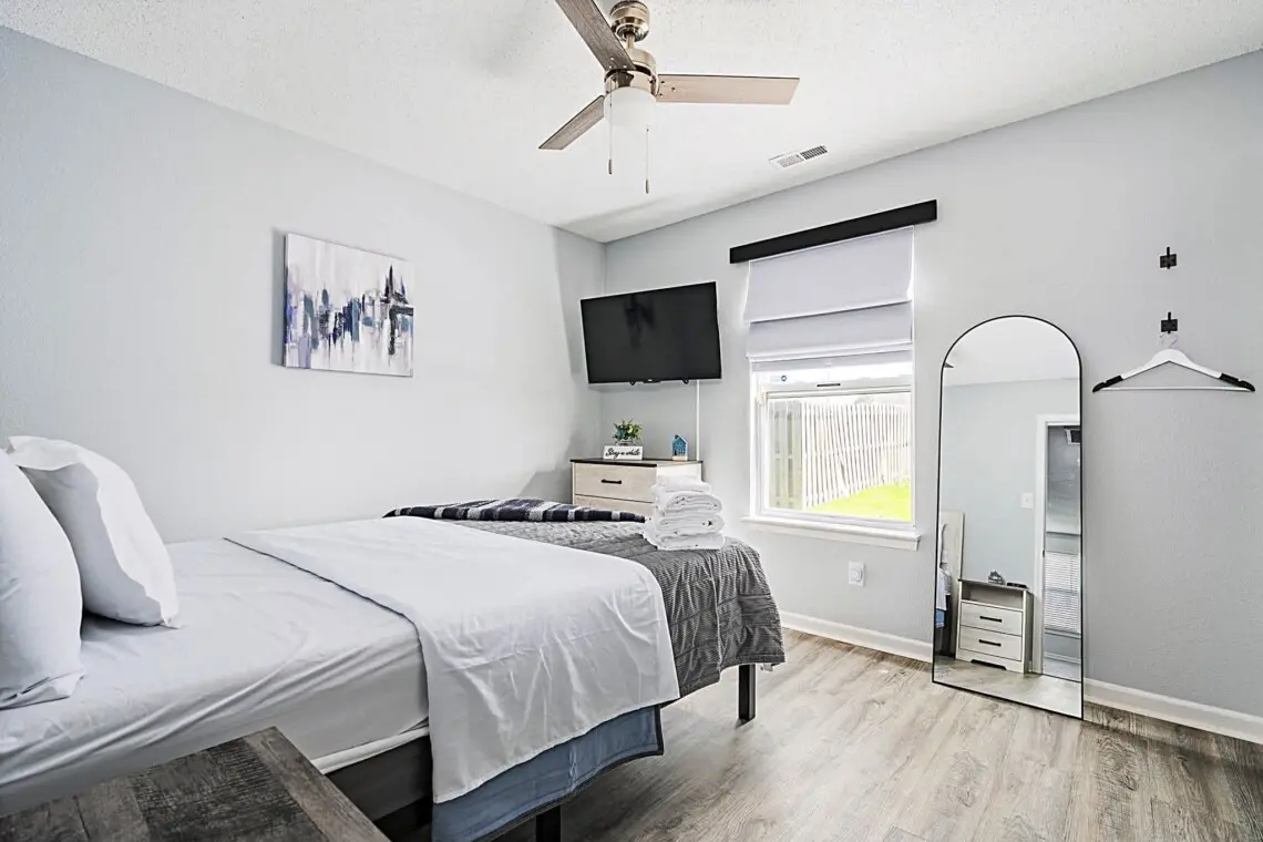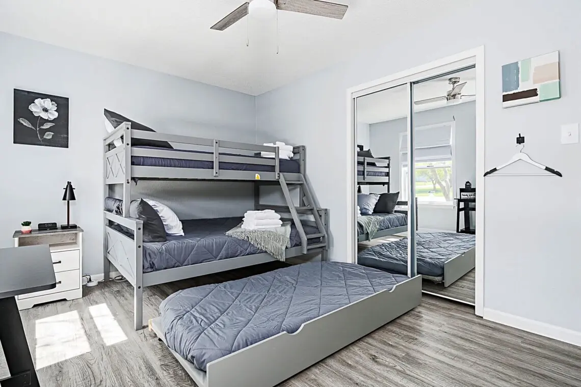 This charming single-floor home accommodates up to 8 guests. The spacious primary bedroom features a luxurious king-size bed, ensuring a restful night’s sleep. The second bedroom boasts a comfortable queen-size bed, while the third bedroom offers a full/twin/trundle combo, perfect for children or additional guests. For extra sleeping space, the couch pulls out into a full-sized bed, providing plenty of flexibility for your group.