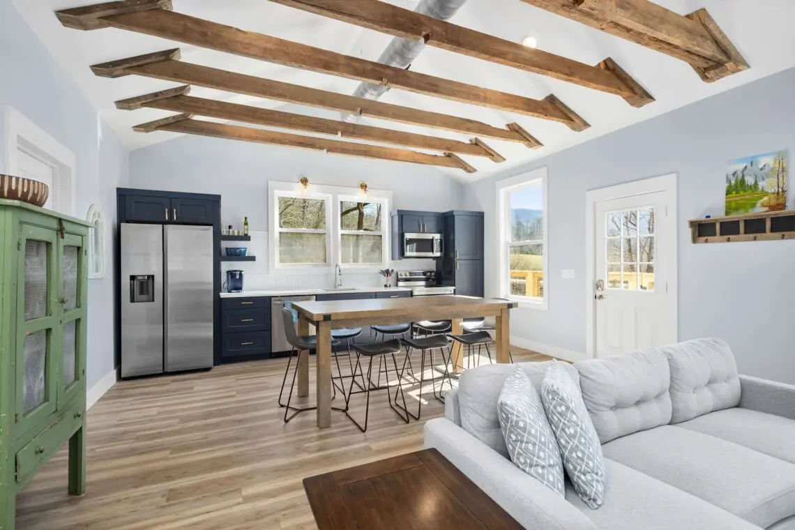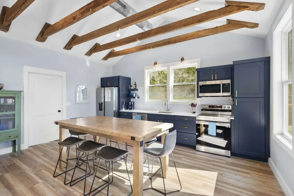 Featuring navy cabinetry, stainless steel appliances, and a spacious dining table, the kitchen is fully stocked with everything you need—coffee maker, wine glasses, toaster, and more.
