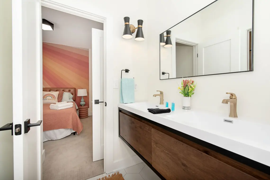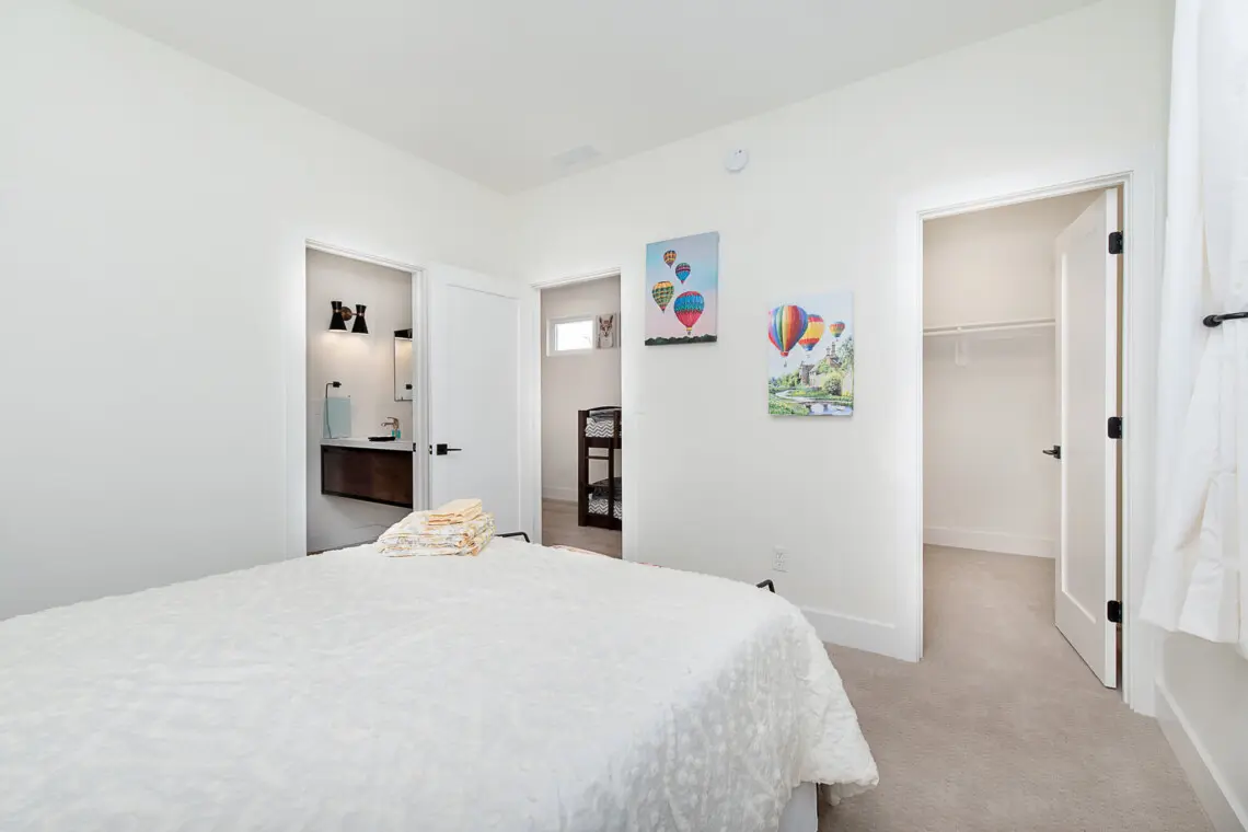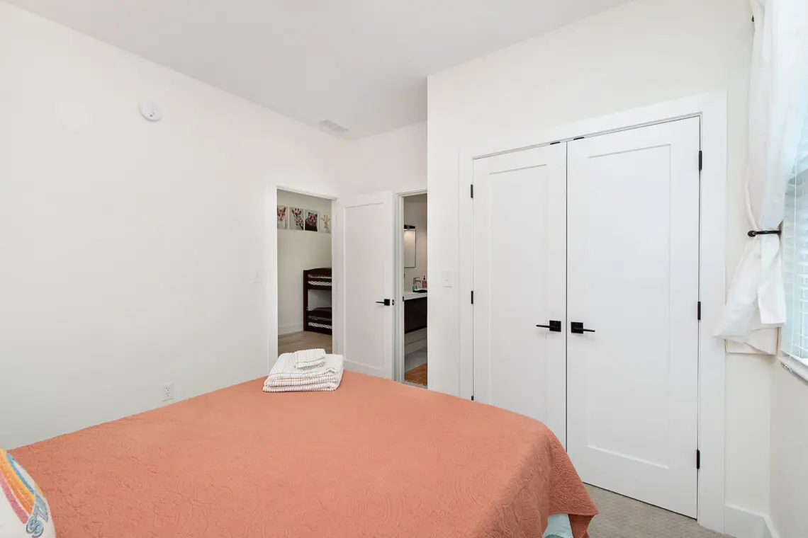The first-floor bedroom includes a comfortable queen bed and convenient accessibility. Upstairs, you’ll find the primary suite with a king bed and ensuite bath, two queen bedrooms connected by a Jack-and-Jill bathroom, and a bunk room ideal for kids or additional guests.