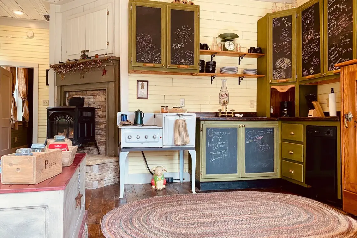 Once the first schoolhouse in Maggie Valley, this one-of-a-kind property has been lovingly restored to celebrate its rich history while providing every modern comfort. Inside, you will find original features like a corn-cob floor patch and student carvings on the beadboard walls, alongside handcrafted furniture and a bookshelf made from the schoolhouse’s original door. The open living space centers around a cozy fireplace and plush seating, while the breakfast nook is ideal for quiet mornings with local coffee and mountain views.