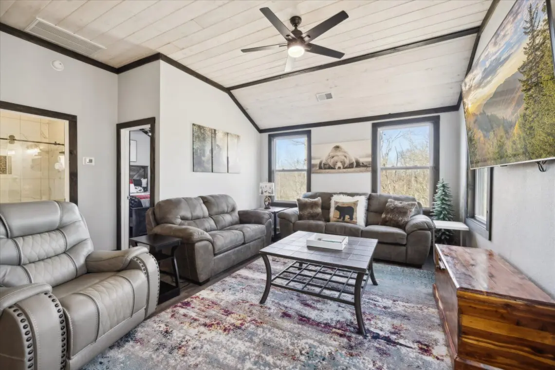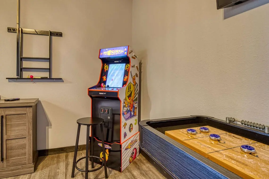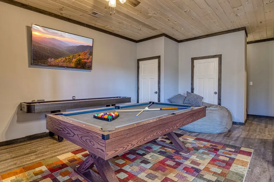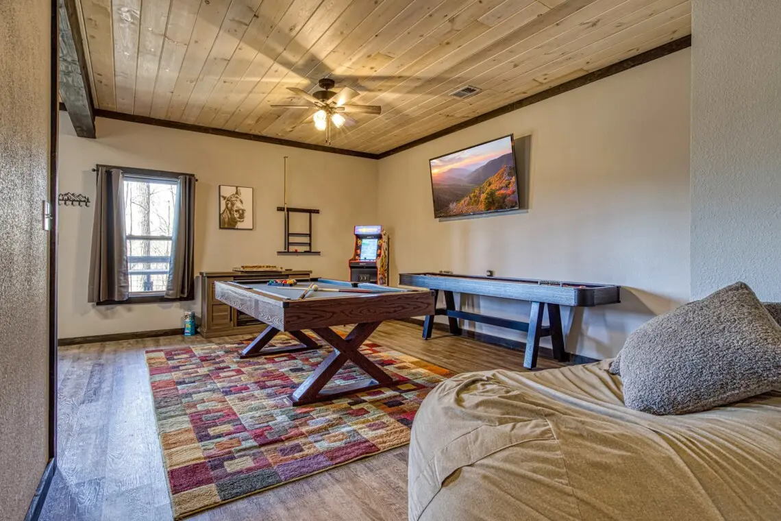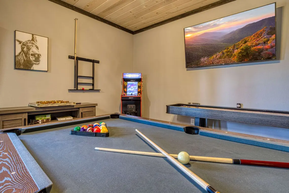 Step outside and enjoy evenings by the cozy outdoor fireplace, soak in the hot tub under the stars, or sway the afternoon away in a relaxing hammock with the mountains as your backdrop. For those who love a little friendly competition, the game room with pool and arcade games guarantees hours of laughter and fun. Inside, you’ll find expansive living areas, a fully stocked kitchen, and comfortable, private bedrooms designed for restful nights after full days of exploring.